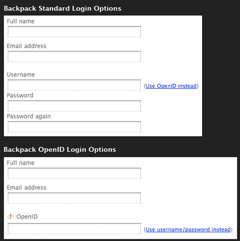 We’ve got two options when logging into Backpack. We can use the traditional username and password pair that most apps use – or we can use the modern OpenID authentication.