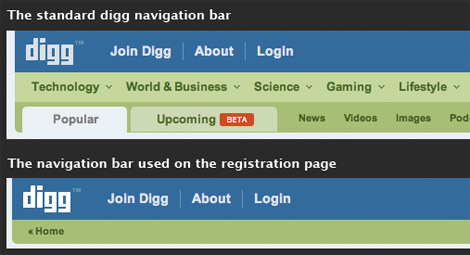 Digg cleverly removes navigation elements from their registration page to keep things simple and give focus to the content relevant to making a new account.