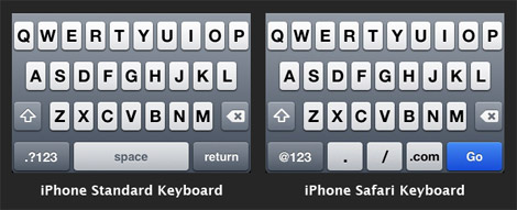 On the left you have the standard iPhone keyboard, and on the right is the keyboard shown when using the Safari web browser. Notice the difference? The space bar has changed to a full stop, a slash and a “.com” key. The “Return” key is now “Go” and the first character in the extras is an “@”.